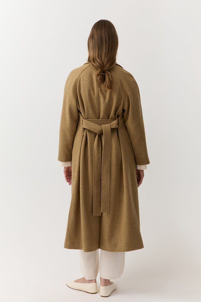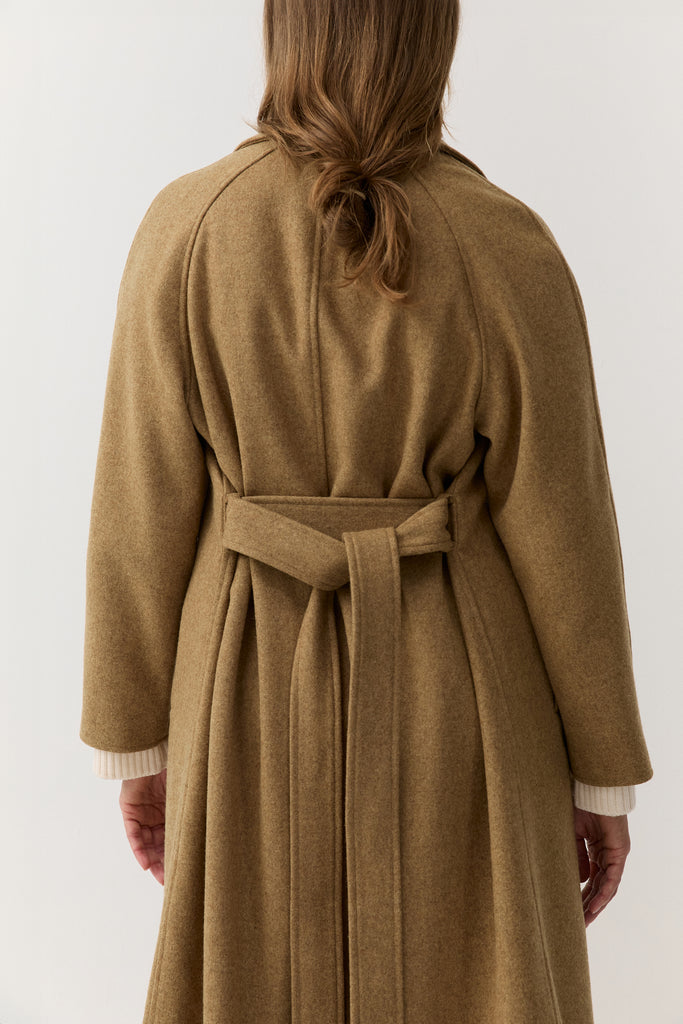 The Belted Wool Overcoat features a relaxed, full-length silhouette with soft raglan sleeves and a clean, effortless drape. Fully lined for comfort and structure, it is finished with a detachable belt for adjustable shaping and a timeless, understated look.
