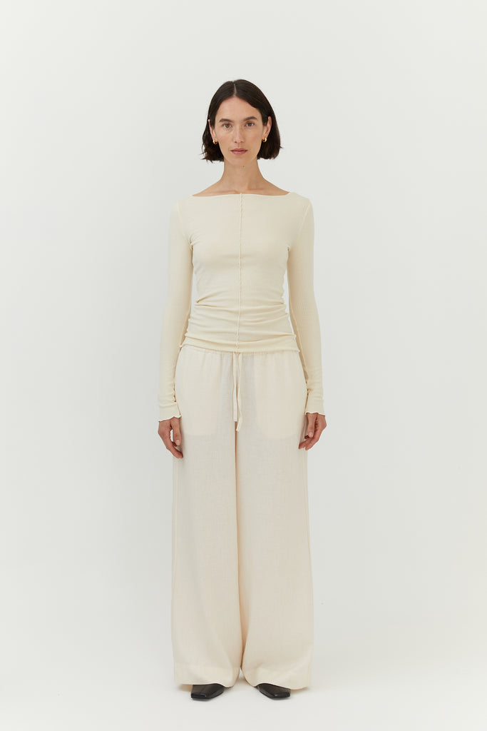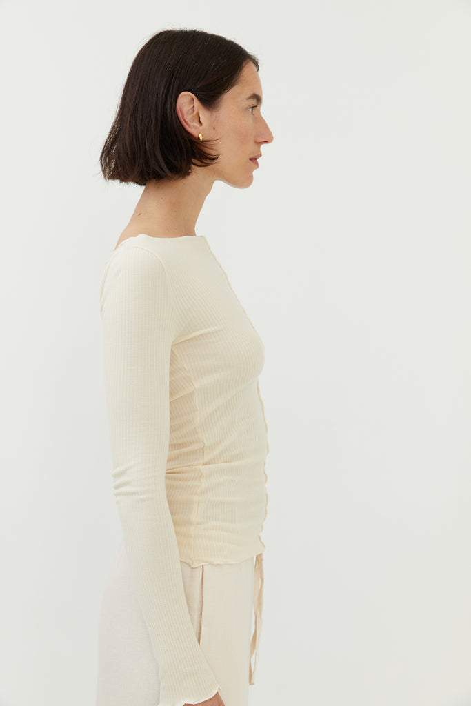 Introducing the Boat Neck Top, the perfect base-layer for your wardrobe. Crafted from a luxuriously soft blend of Lyocell TENCEL™ and degradable elastane, this top has a slightly sheer rib structure. It features a flattering boat neck cut and a long-sleeved silhouette that will ensure you look as refined as you feel. The stretchy ribbed texture provides a snug fit, making this an elegant addition to any outfit.