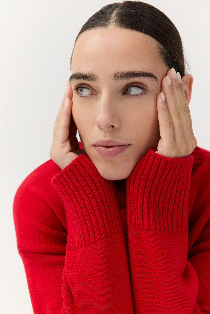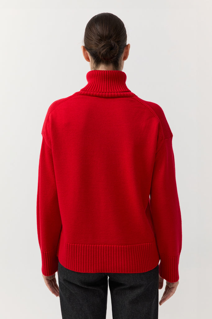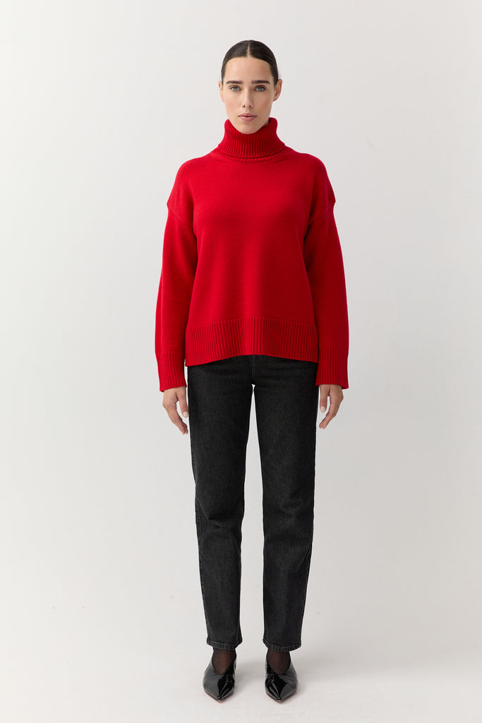 A softly structured knit designed for warmth and ease. Made in Portugal from extra-fine, mulesing-free merino wool spun by Tollegno 1900 — a heritage Italian mill known for responsible craftsmanship. The 7-gauge knit has a smooth, compact texture with a reassuring weight. Fully fashioned details and wide rib trims add structure to its boxy silhouette with dropped shoulders and a high turtleneck.
