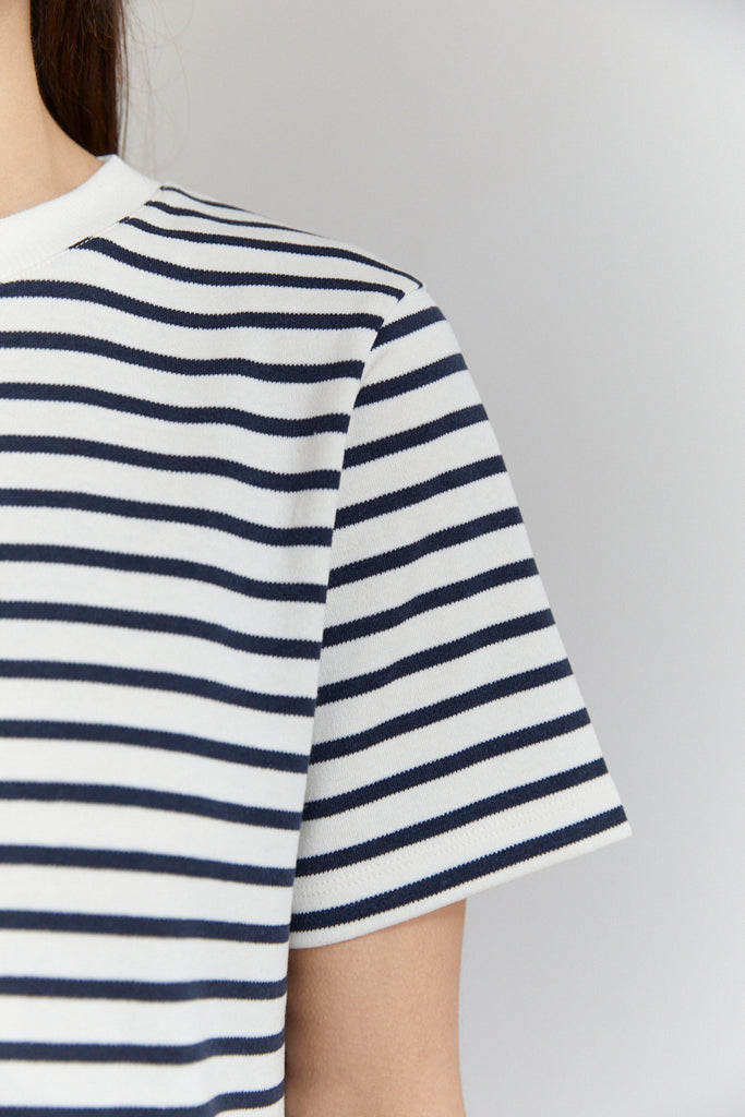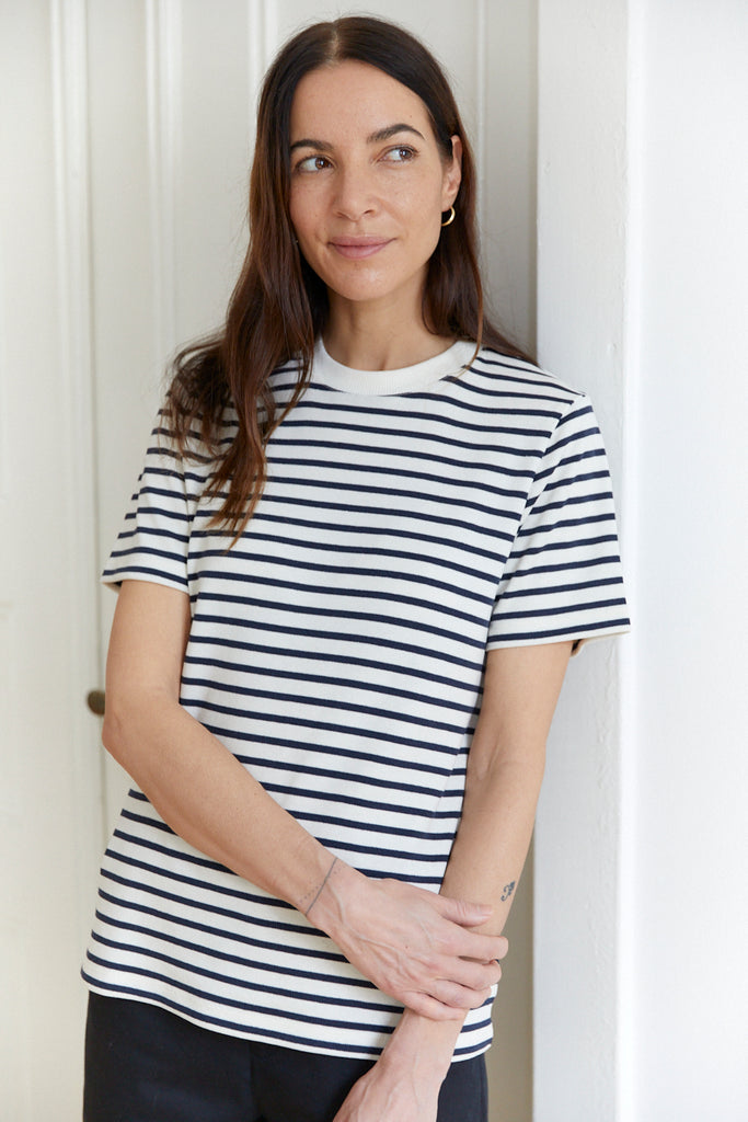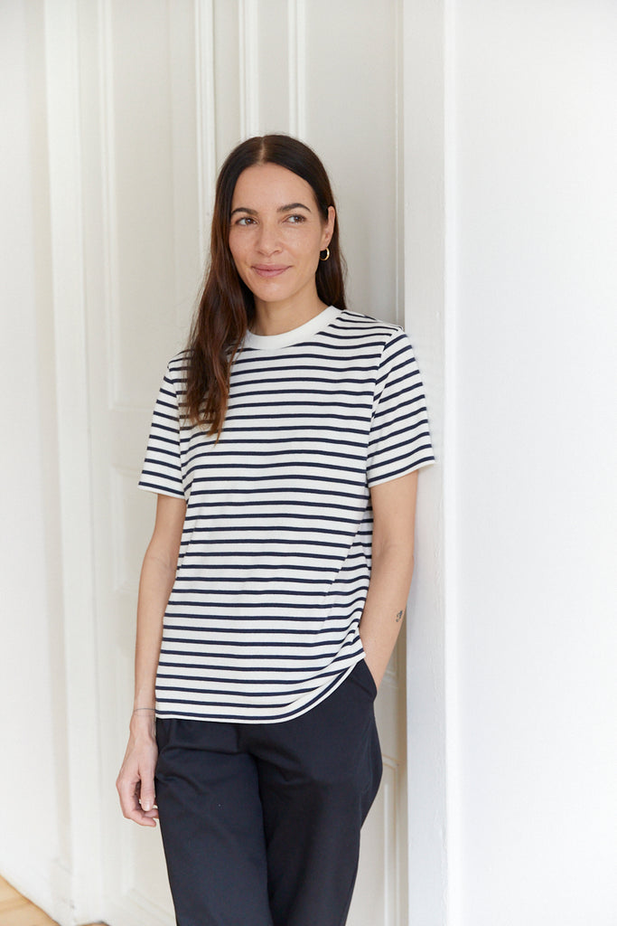 It doesn't get more classic than this. This is a relaxed fitting, short-sleeved T-Shirt with a ribbed crew neckline. A staple in every wardrobe, featuring navy and ecru stripes.