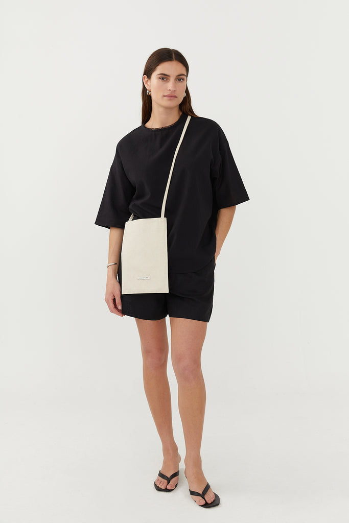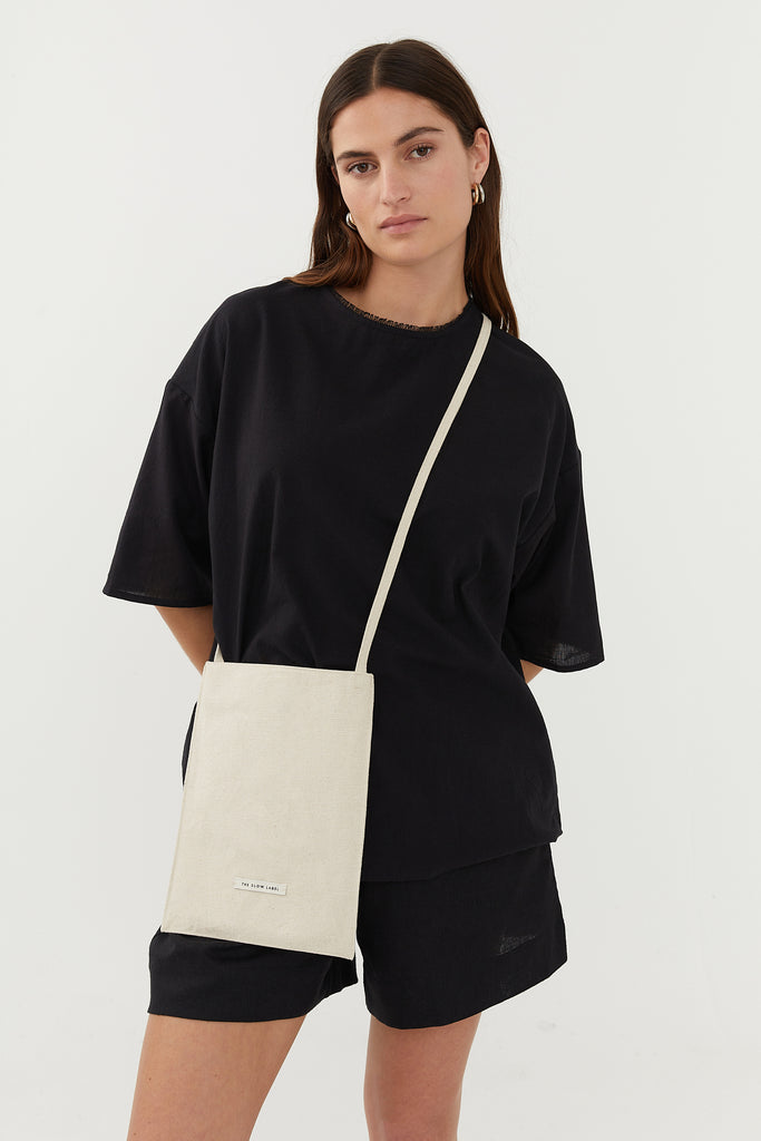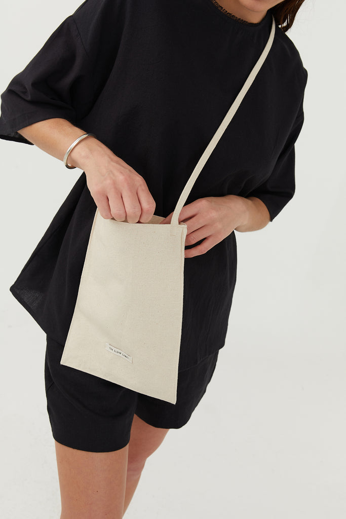 Our Crossbody Bag is crafted from a robust blend of organic cotton and hemp, giving it a sturdy yet lightweight feel. This slim, minimalistic bag features a crossbody design for easy carrying, with an internal pocket for keeping your essentials secure. Its canvas texture adds durability, and the undyed finish gives it a clean, understated look. The low-waste pattern minimizes material waste during production, highlighting the thoughtful design process. Ideal for everyday use, this Crossbody Bag offers a sleek and practical choice for any outing.
