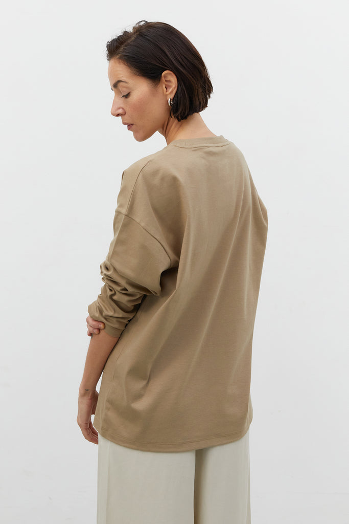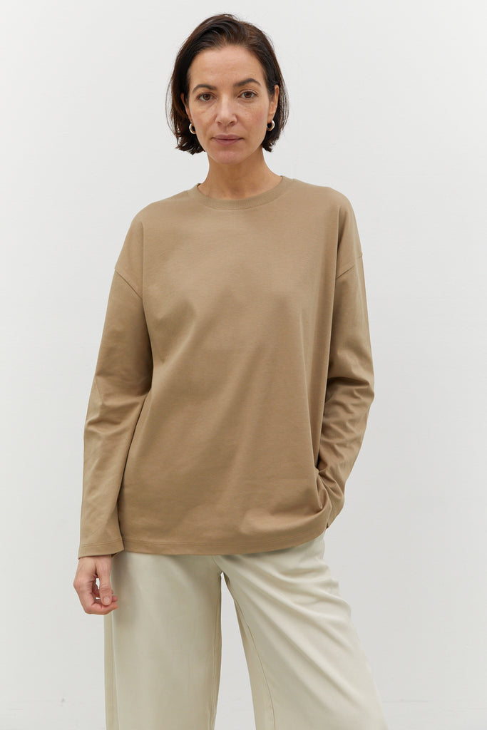 An elevated basic. This effortlessly chic long-sleeve tee consists of a soft interlock jersey fabric, crafted from 100% organic cotton. It features dropped shoulders with long sleeves and an overall comfortably loose fit.